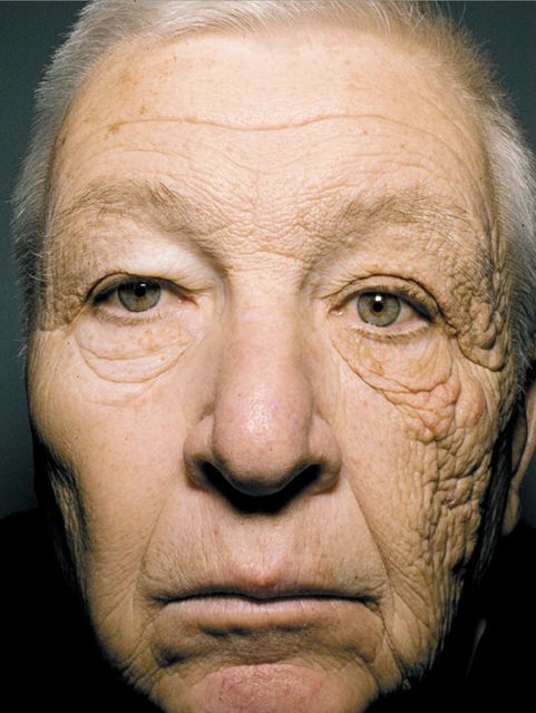 Általában szimmetrikusan öregszik az ember arca, ezért nem tűnik fel mekkora károkat okoz az UV sugárzás. Az ezen a képen látható két oldal közötti különbség számomra sokkoló. A fotón szereplő úr 28 éven át kamionsofőrként dolgozott, tehát ez idő alatt folyamatosan csak a bal oldalán érte az UV sugárzás.